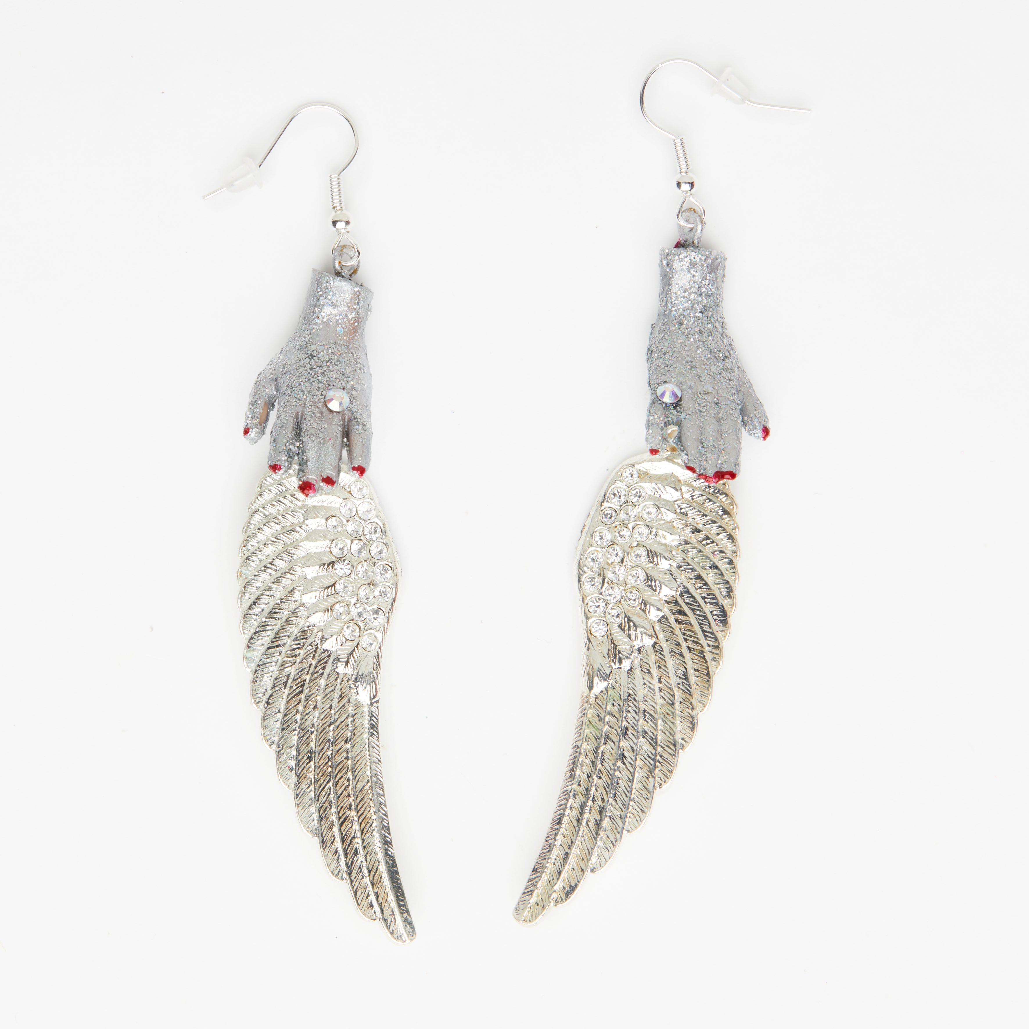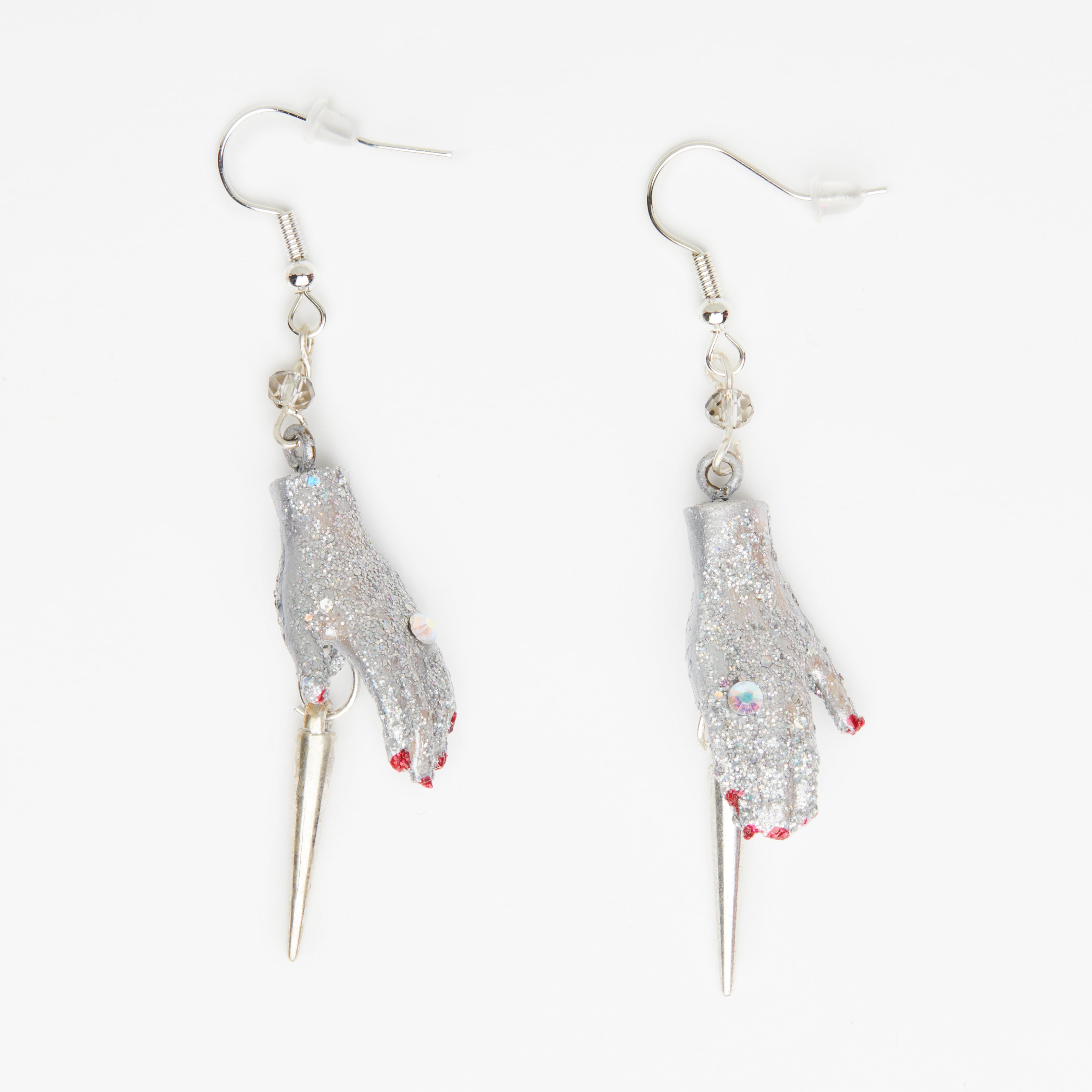 silver spike earrings with silver dolls hands