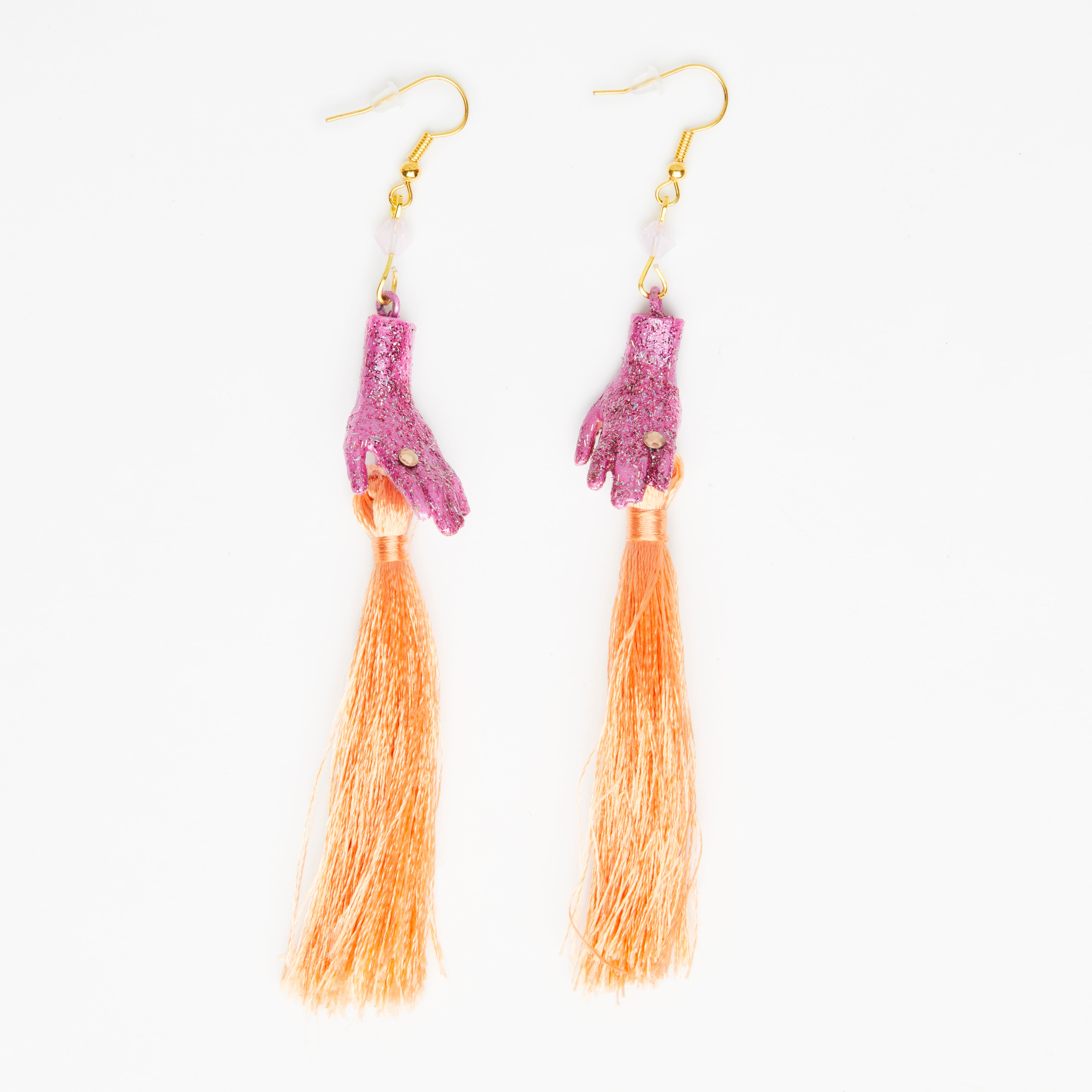 pink dolls hands earrings with salmon pink silky tassels