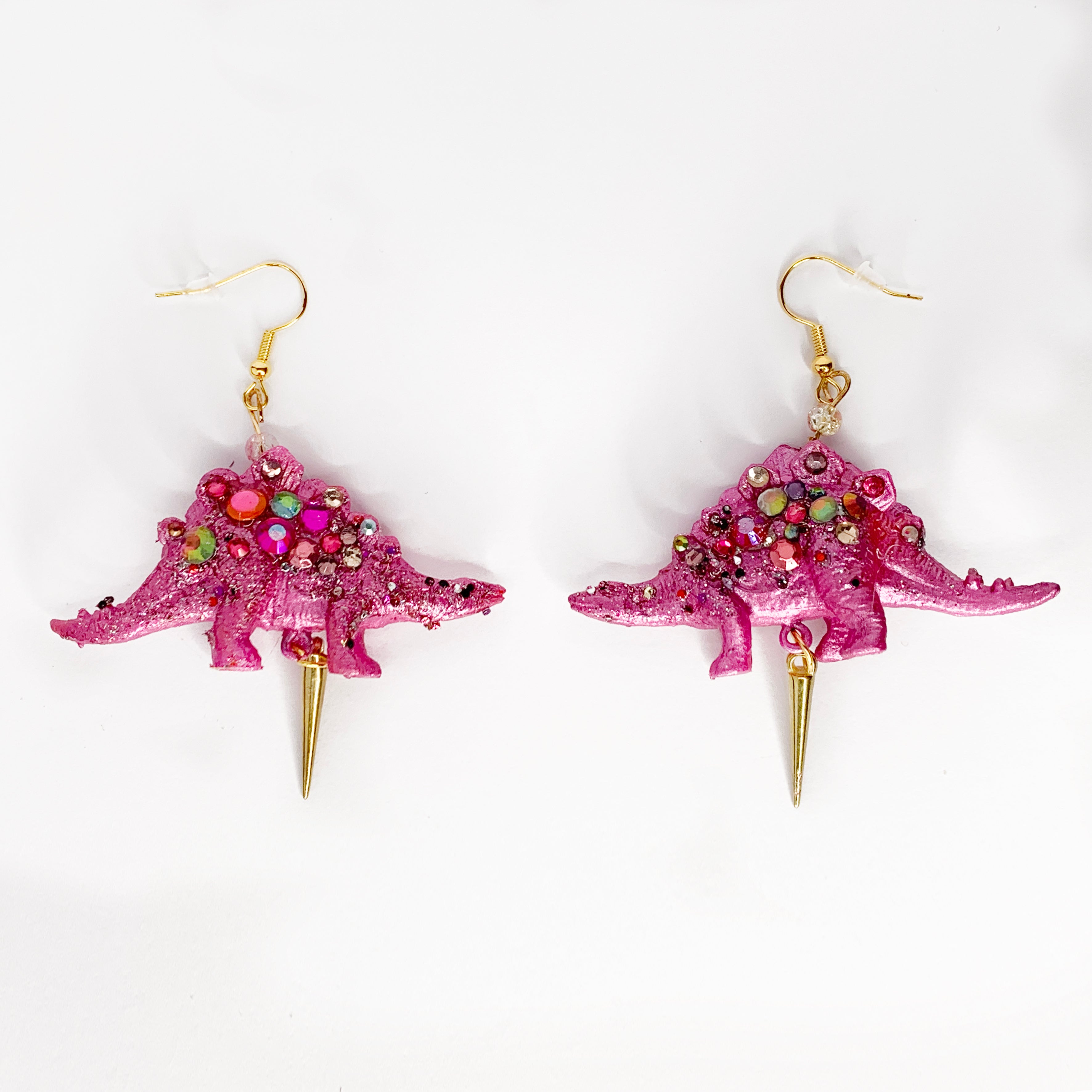 pink iridescent stegosaurus pink dinosaur earrings with golden spike